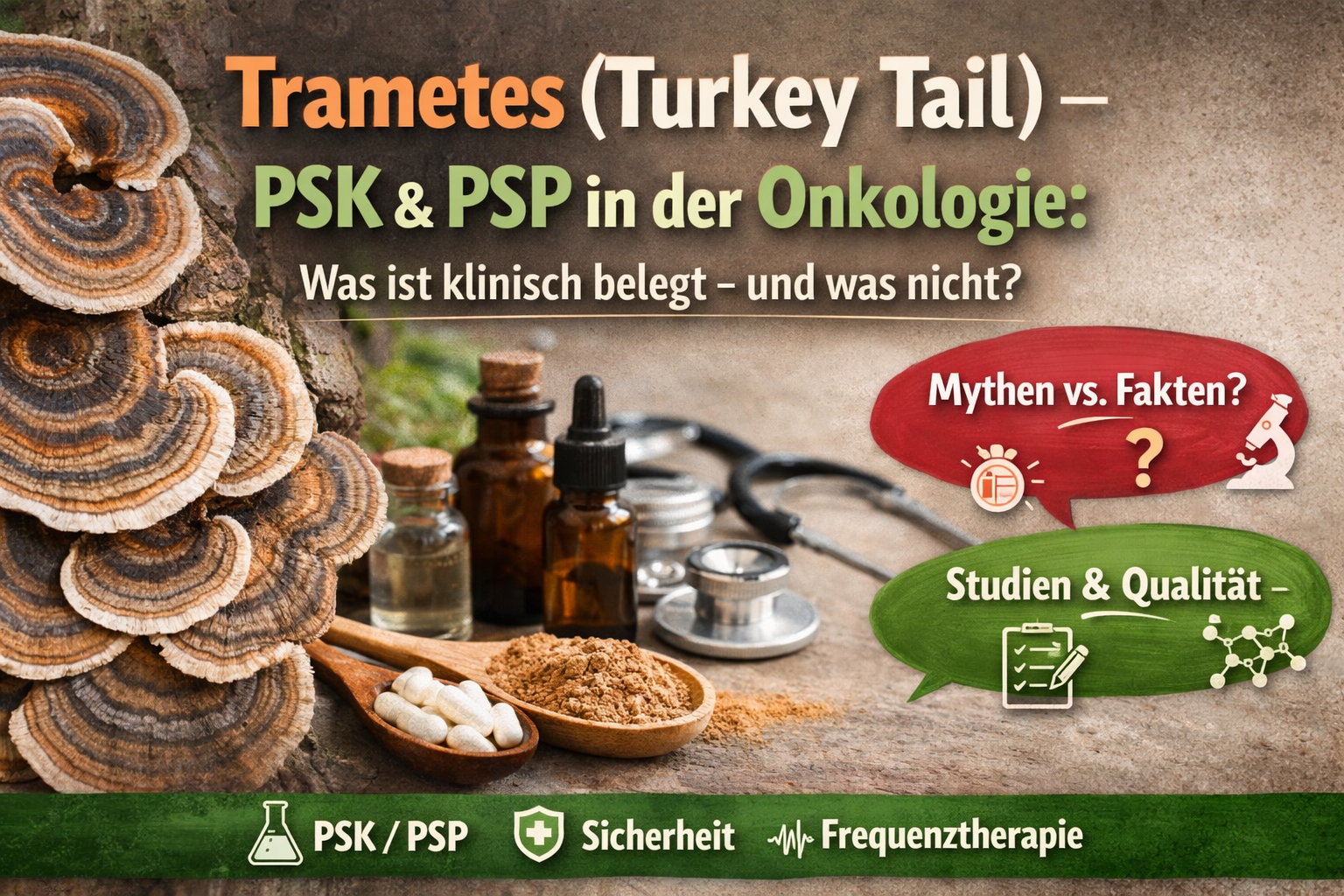 Wenn in der Mykotherapie über Trametes versicolor (früher oft Coriolus versicolor, „Turkey Tail“) gesprochen wird, fallen fast immer zwei Kürzel: PSK und PSP. Und genau hier beginnt die Verwirrung – denn Pilzpulver, Heißwasserextrakt und pharmakologisch standardisierte Extrakte sind nicht dasselbe. Damit du in deinen Inhalten sauber, wissenschaftlich und zugleich verständlichLesen Sie weiter