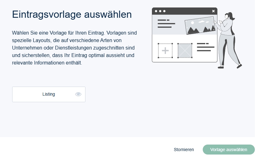 Damit die Auswahl für Sie einfacher ist, gibt es nur eine Vorlage: „Listing“. Bitte wählen Sie diese aus und bestätigen Sie anschließend mit „Vorlage auswählen“.